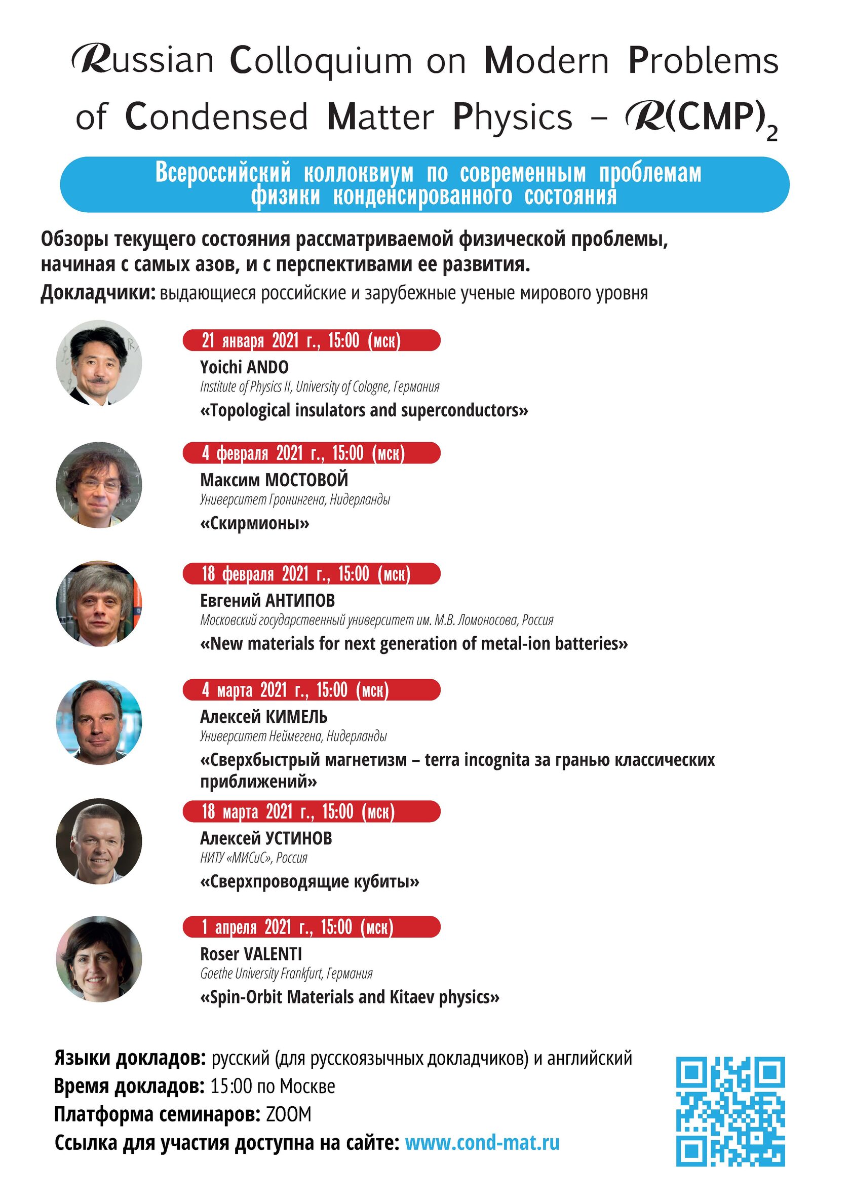 Цель данных коллоквиумов - представить обзор текущего состояния и основных тенденций в физике конденсированного состояния. Мы просим лекторов учитывать, что тема их исследований может быть не слишком знакома большей части аудитории, и поэтому объяснять всё “с самых азов”.